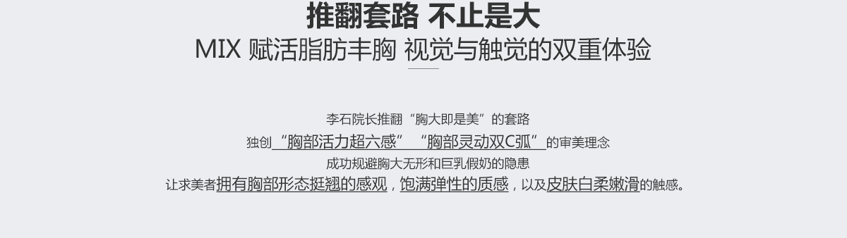 从医20年来,李石院长不断创造与革新,在脂肪管理 和形体美学领域专注钻研,自主研发,拥有属于自己 的专利技术和美学理念。他是国际整形界研究领域国 际标杆,将中国脂肪移植技术保持在国际前沿,研创 “MIX脂肪赋活移植系统” 引领脂肪创新技术新潮流, 为更多脂肪求美者实现焕美需求。